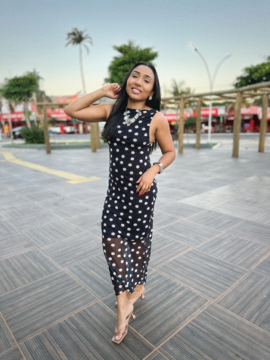 Em tule macio com estampa poá clássica, o vestido midi traz movimento, delicadeza e aquele toque moderno que transforma qualquer look.